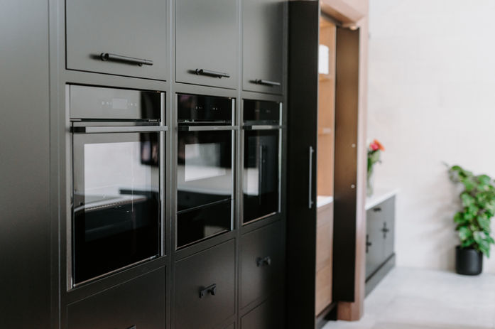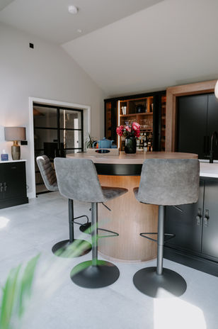 This Ravens Barn Bespoke Kitchen combines style and functionality seamlessly. The elegant black cupboards and roundal create a perfect space for socializing. While Ceaserstone Cloudburst worktops complement the solid black cupboards. The kitchen is equipped with the latest Neff appliances and smart storage solutions, making cooking a breeze. We worked closely with our client to get the perfect finish some of these were the Armac Martin solid handles and Quooker luxury taps.